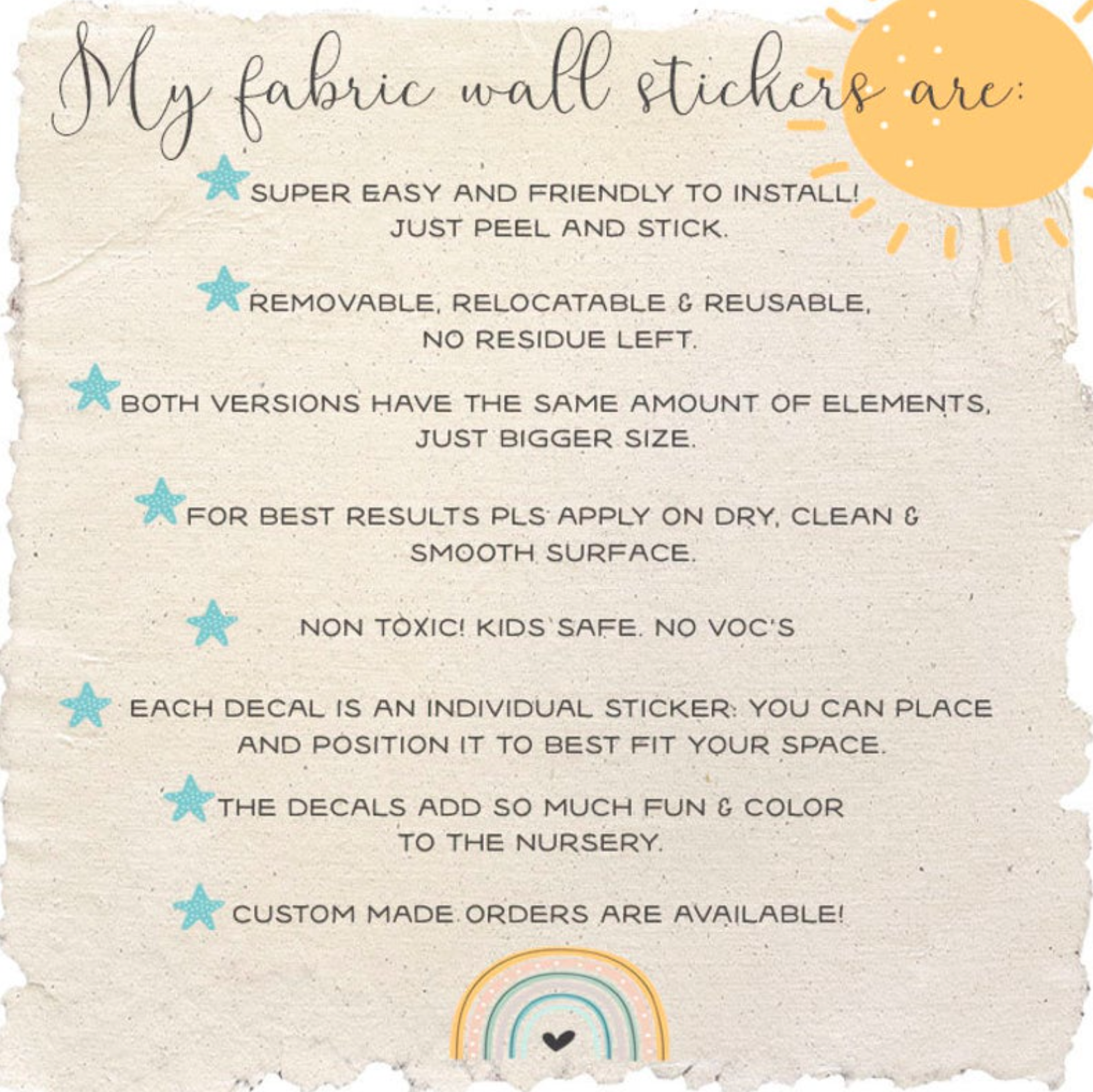 Fabric Wall Decals give the look of a hand-painted design without the cost, time, and permanent paint on your wall. They are easy to apply and can be easily removed without damaging your walls or leaving any residue. My decals can be applied to walls, doors, windows, or any other solid, smooth or semi-textured surface. With these wall decals, you can transform an entire room on a small budget and let your imagination go wild.