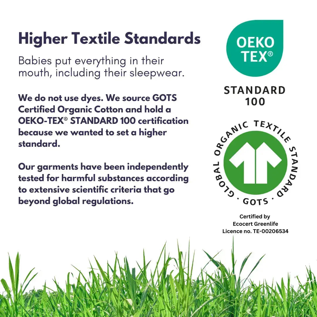 Our sleepwear is super easy to wash with all your other baby clothes, no toxic dyes, and certified by GOTS and OEKO-TEX Standard 100, meaning no harmful chemicals are used. Babies put everything in their mouths and their sleepwear is no exception!