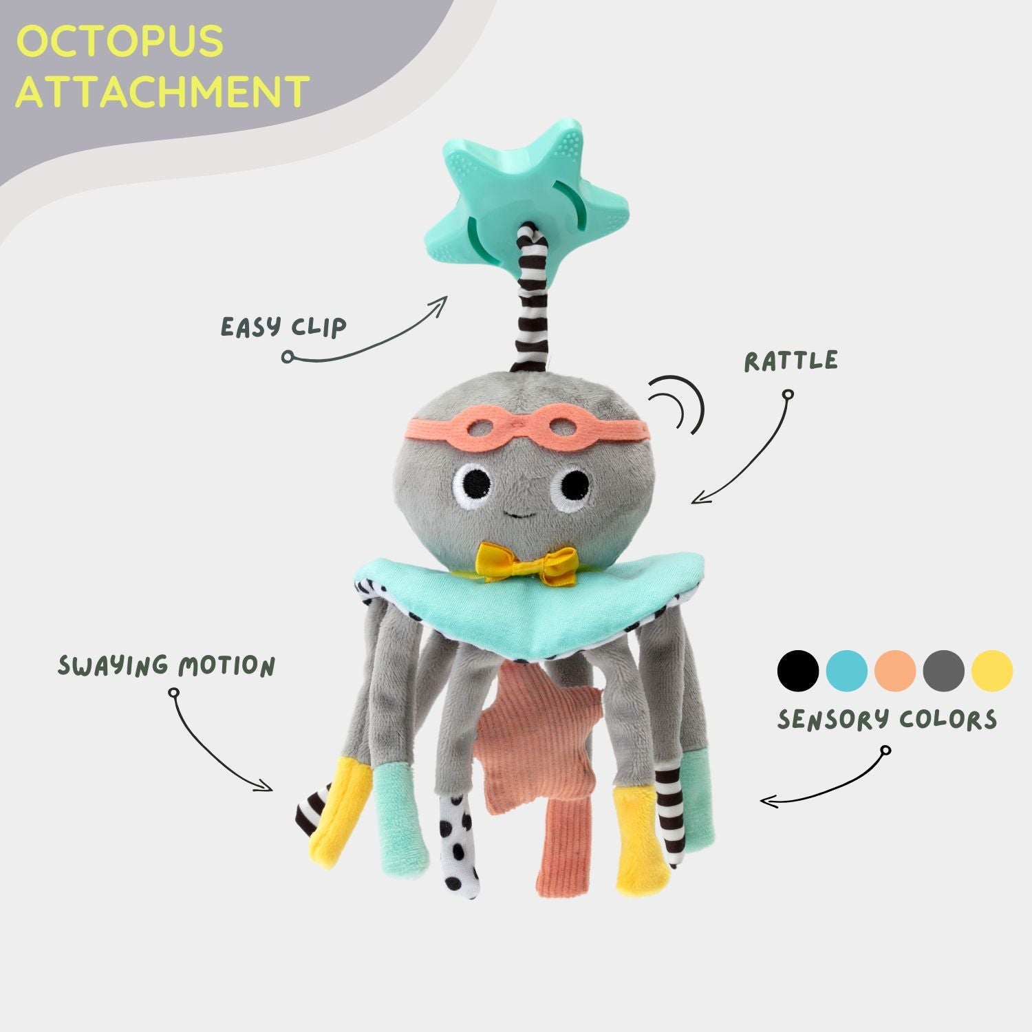 Ollie the Octopus Mobile Attachment: Say hello to Ollie, your new mobile sidekick! This plush octopus attaches to the sensory rod, transforming it into a portable mobile. Ollie is super soft, and thanks to the gentle baby-safe chime in its head, it creates a calming sensory experience that’ll keep baby happily occupied at home or on trips around town!