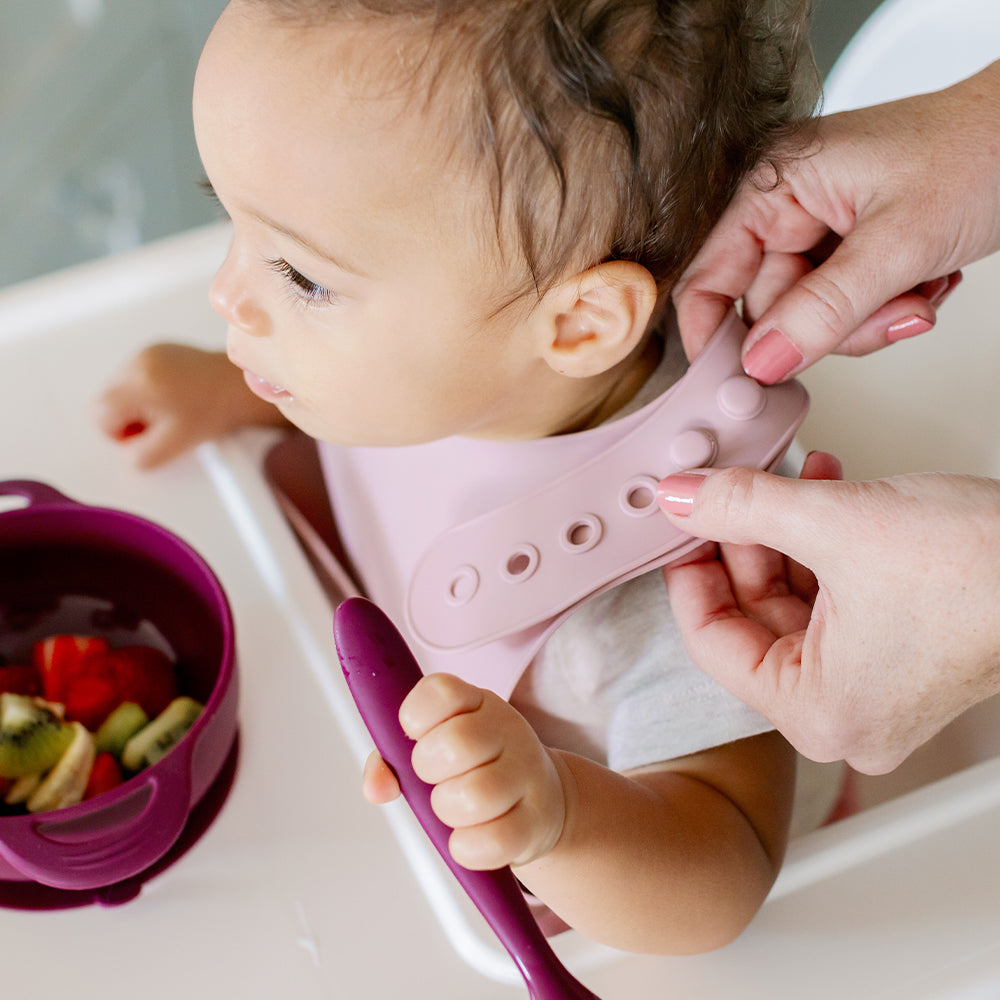 Keep mealtime tidy and hassle-free with the Foodie® Roll Up & Button Closed Bib 2-Pack: All Silicone—the stylish, functional choice for your mini foodie!