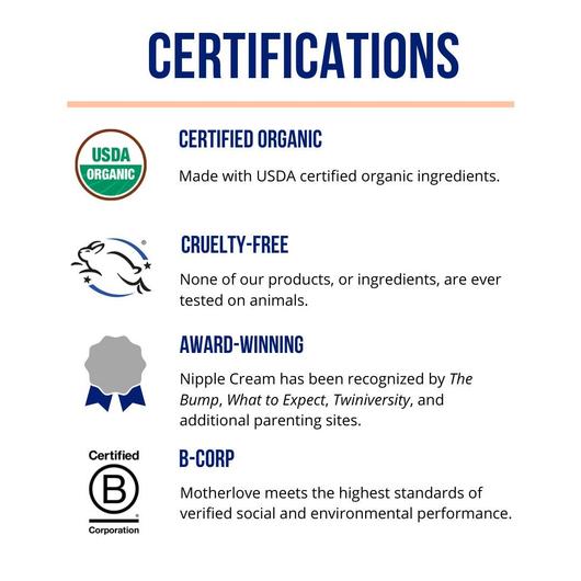 We want the best for you; Nipple Cream is Certified Organic by Oregon Tilth(which also means non-GMO!), Certified Cruelty Free by Leaping Bunny, and clinically tested not to cause irritation. Does not contain petroleum or petroleum by-products, lanolin, parabens, phthalates, or synthetic fillers.