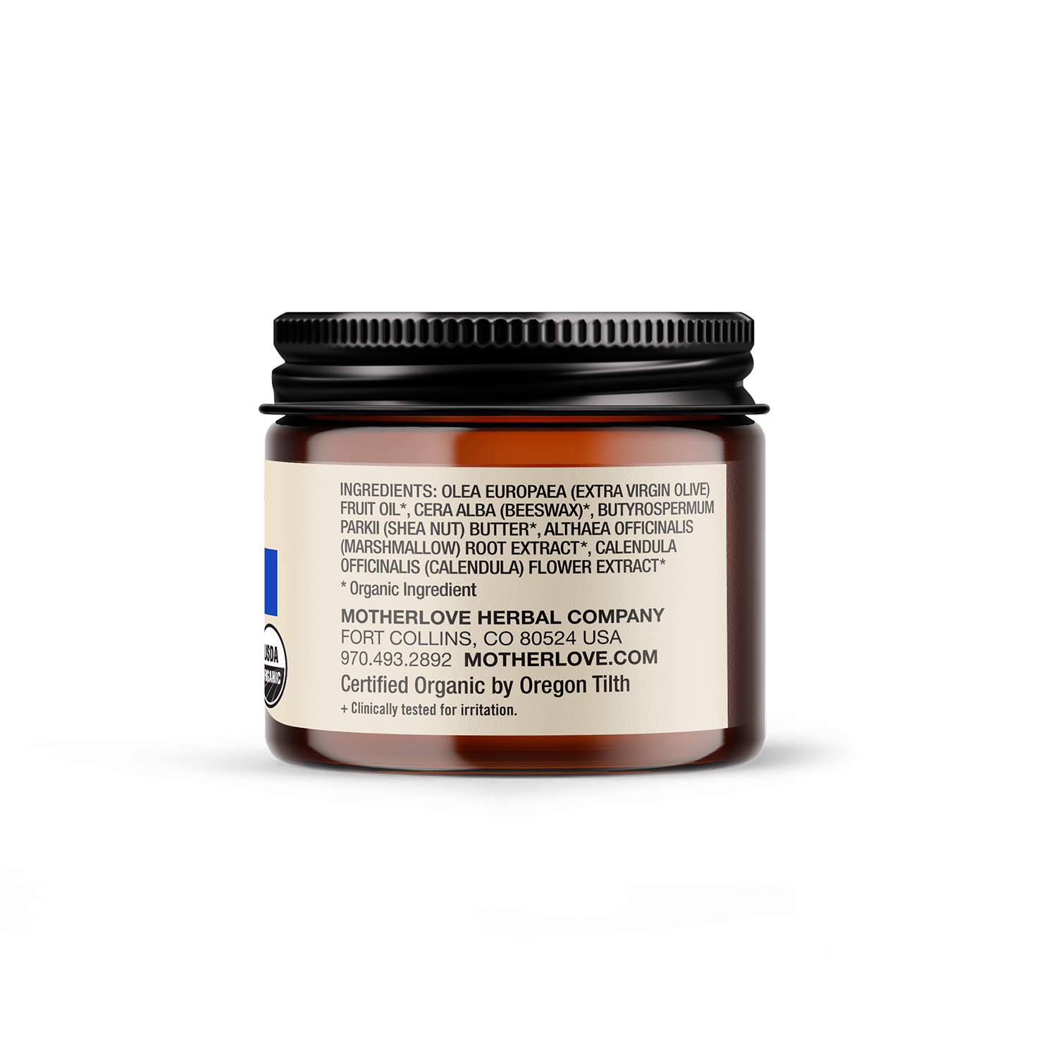 Ingredients: Extra virgin olive oil*, beeswax*, shea butter*, marshmallow root*, calendula flower*. Clinically Tested to Not Cause Irritation. (*Certified Organic by Oregon Tilth)