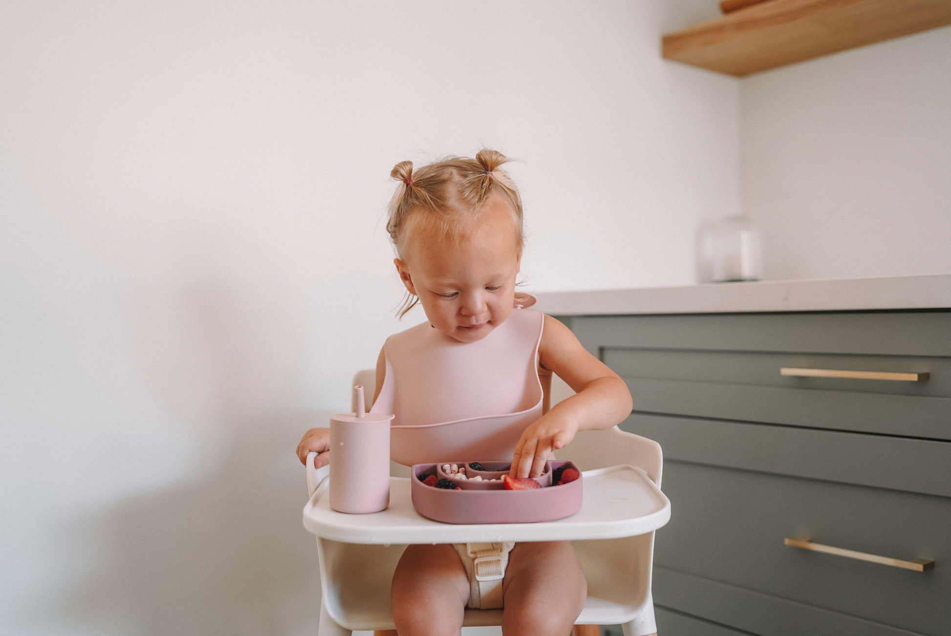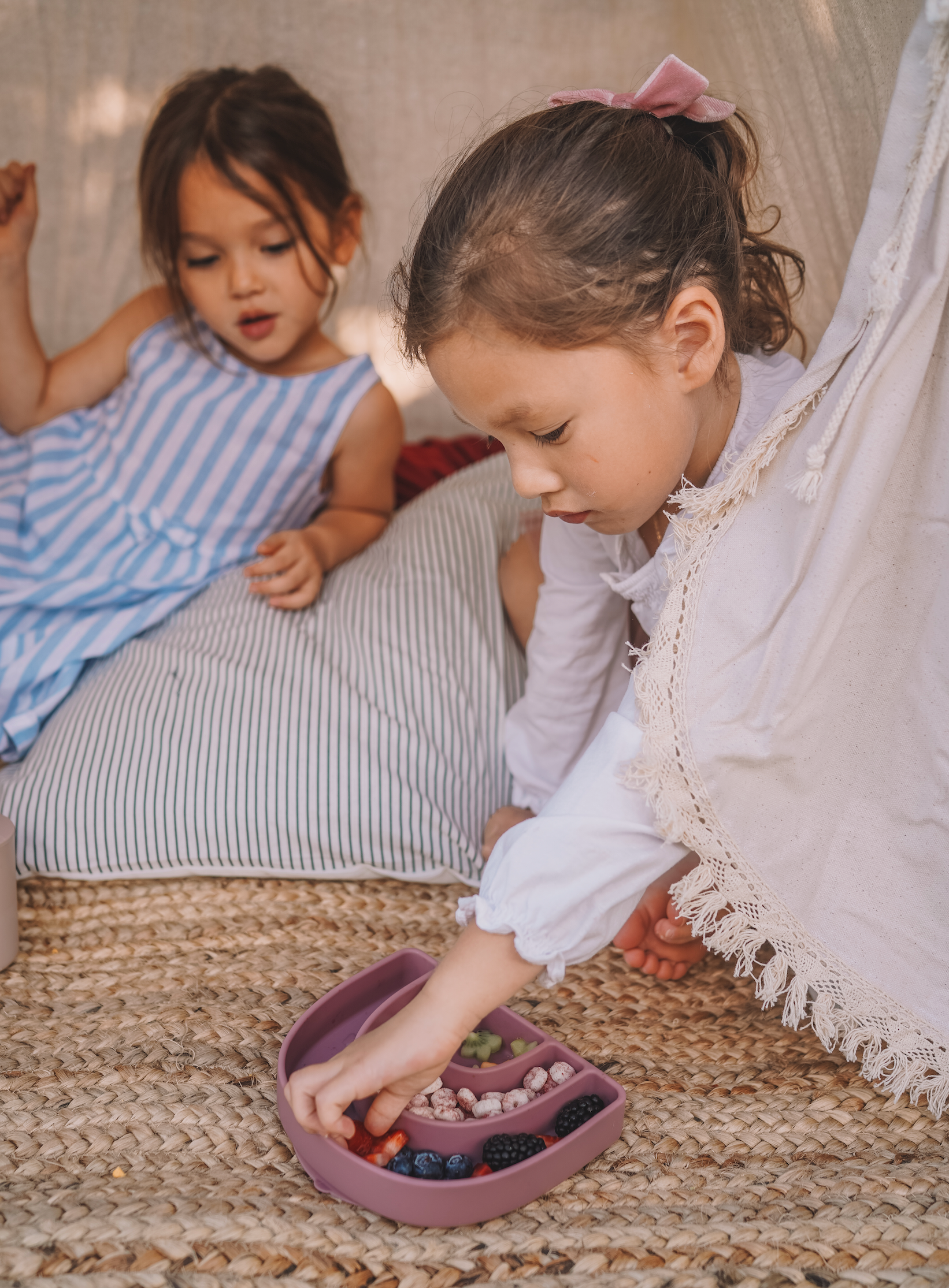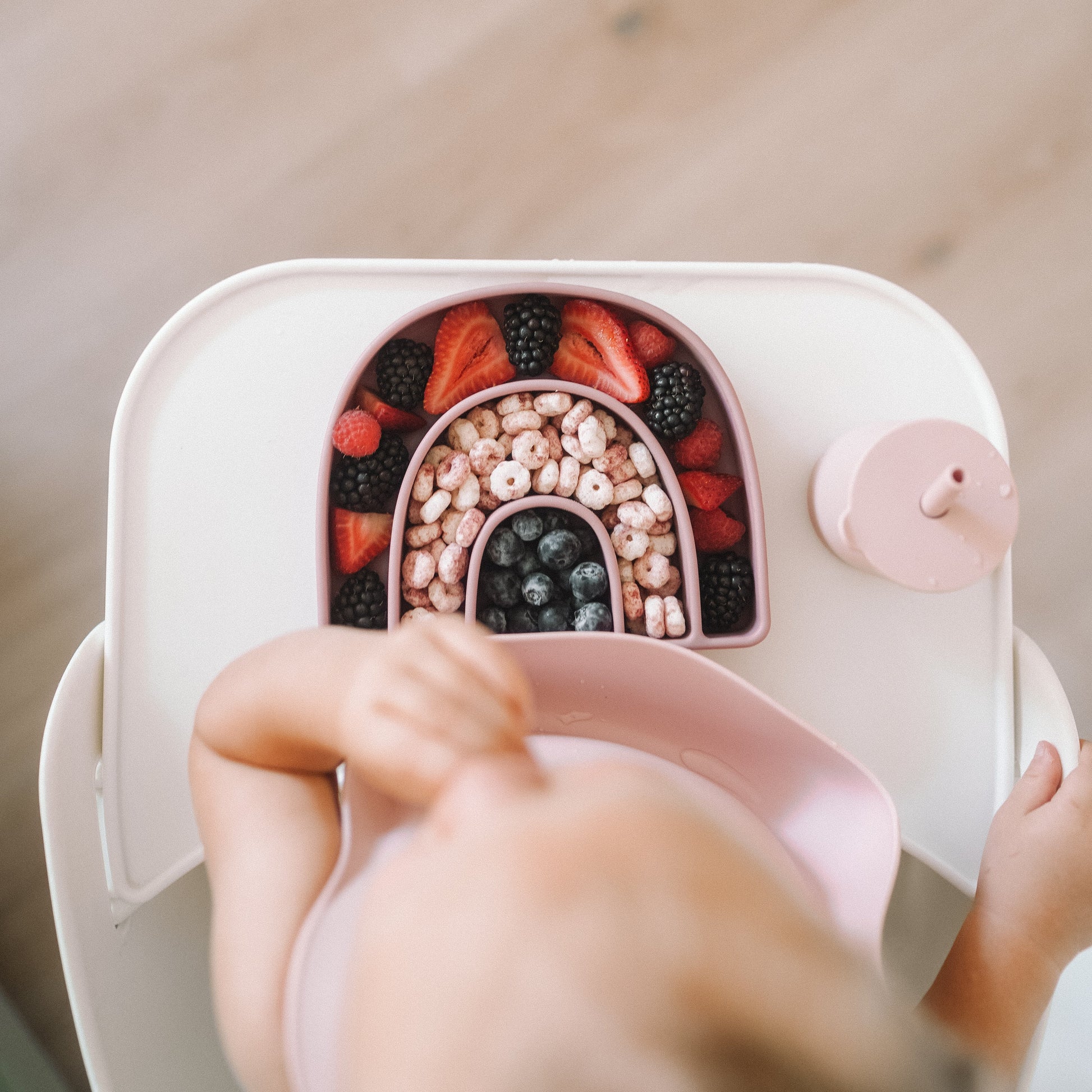 Our Rainbow Plates bring the fun to mealtime and feature a divided design, perfect for separating fruits, veggies, snacks, and more. The innovative suction base securely attaches to any smooth surface, making it challenging for little ones to pull off—ideal for promoting independent eating. As your little one graduates to using utensils, we love to use this plate as a fun snack board.
