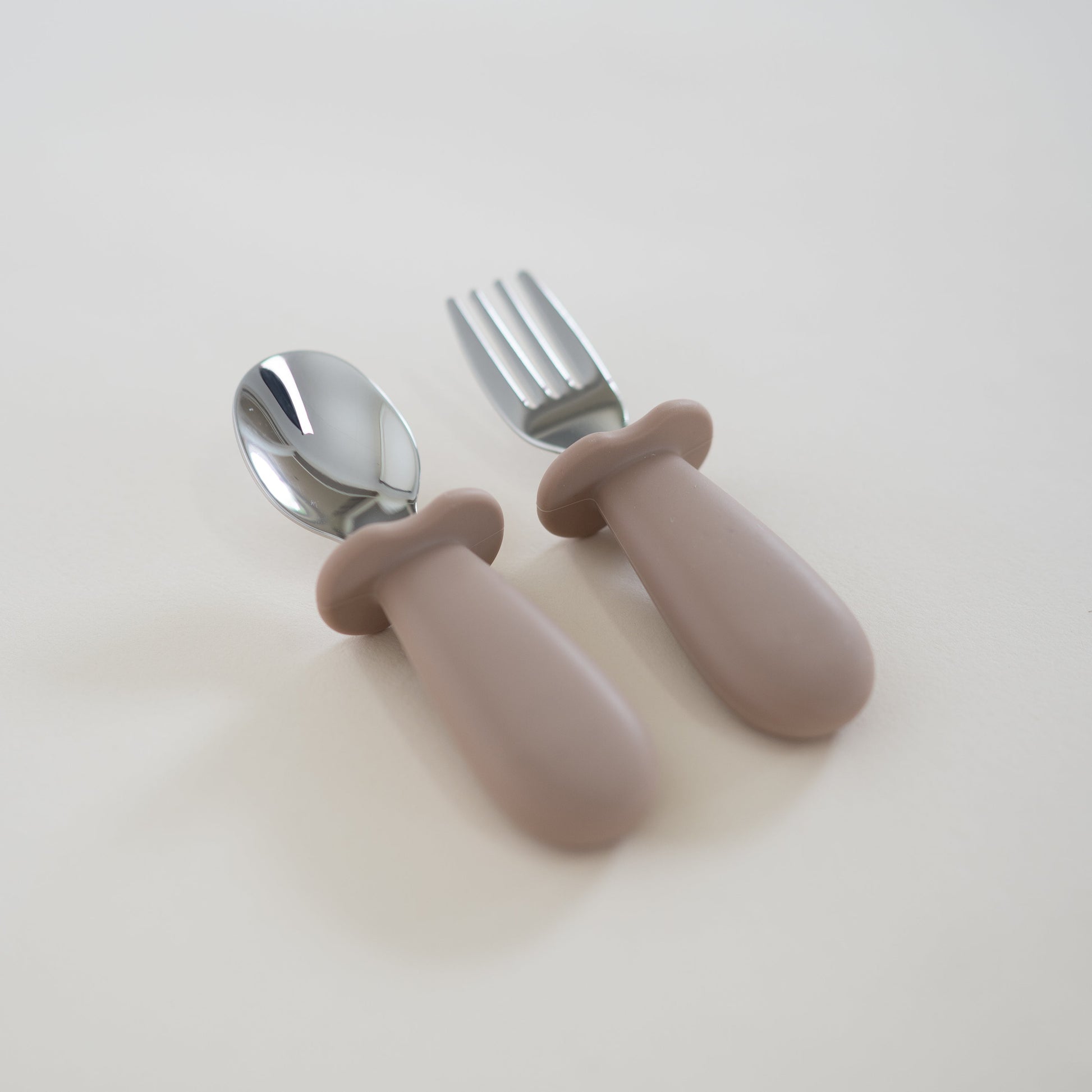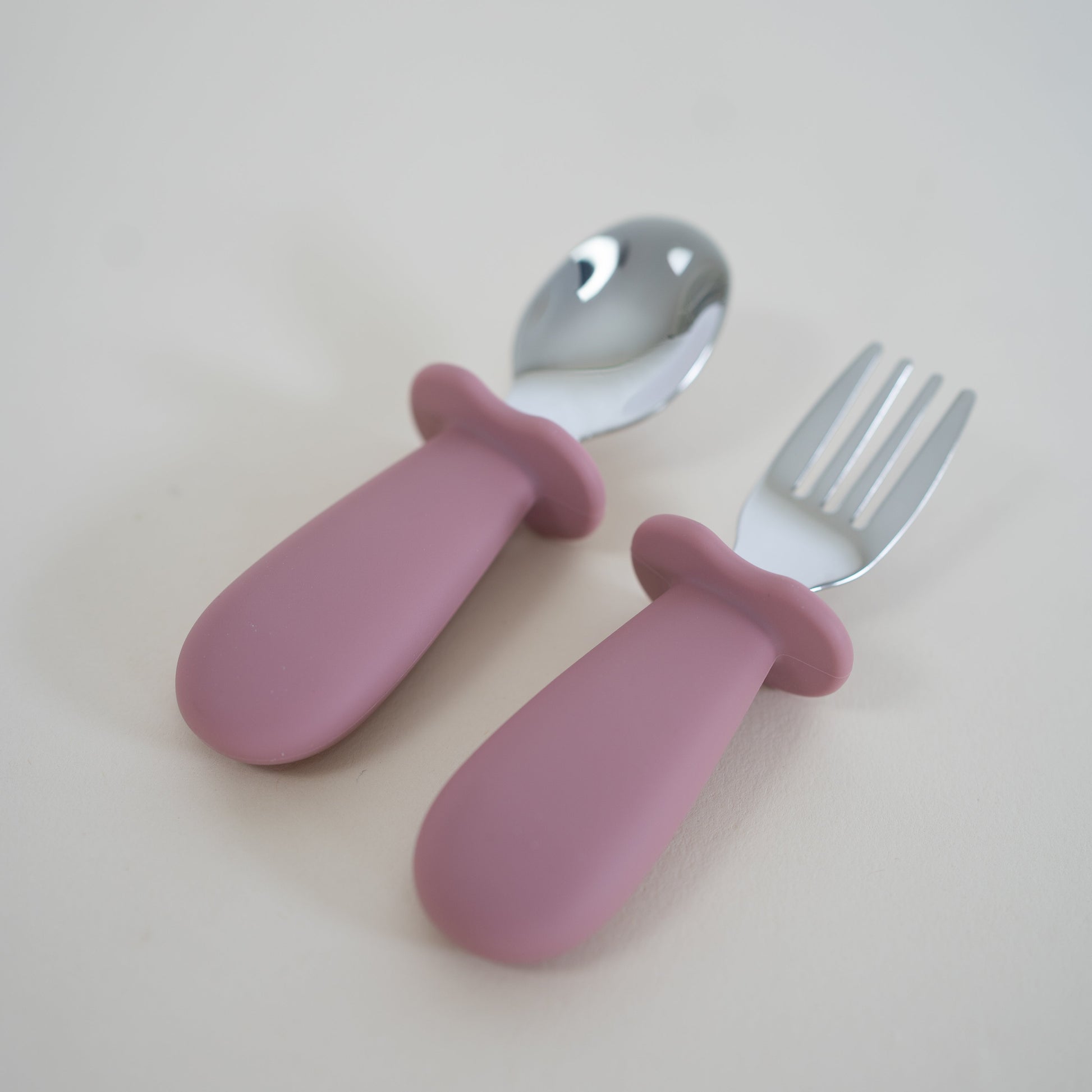 The toddler cutlery set includes a fork and spoon featuring a stainless steel mouthpiece and a chubby silicone handle - perfect for small hands to grip.